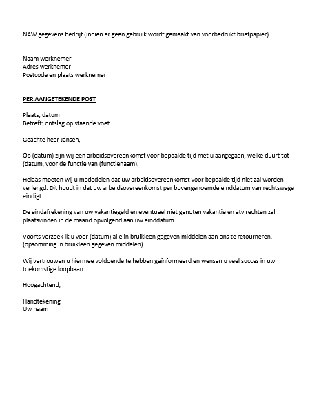 Helaas moeten wij u mededelen dat uw arbeidsovereenkomst voor bepaalde tijd niet zal worden verlengd. Dit houdt in dat uw arbeidsovereenkomst per bovengenoemde einddatum van rechtswege eindigt.